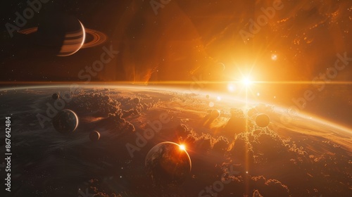 Canvas Print : Sunrise over group of planets in deep space, cosmic exploration and astronomical discovery concept