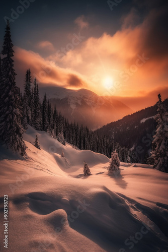 The watermark will not be included on Canvas Print.: Sunset in snowy mountain generative ai