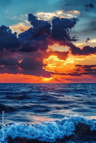 The watermark will not be included on Canvas Print.: Sunset over ocean with waves