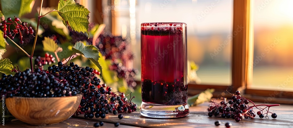 The watermark will not be included on Canvas Print.: Table near window with elderberry drink and jam featuring sambucus berries displayed for a copy spac