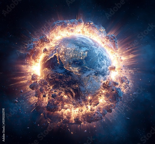 The watermark will not be included on Canvas Print.: The earth exploding in space, a stock photo, 3d rendering, hyper-realistic, high-resolution, high-de