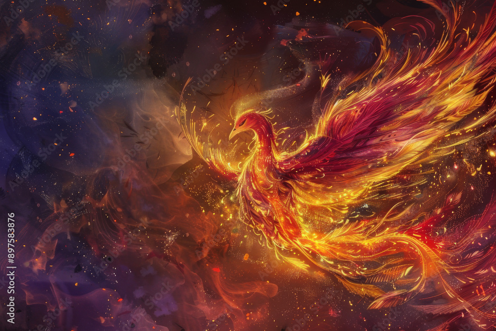 The watermark will not be included on Canvas Print.: The moment of a phoenix rebirth, with the mythical bird emerging in a blaze of flames and ash - gene