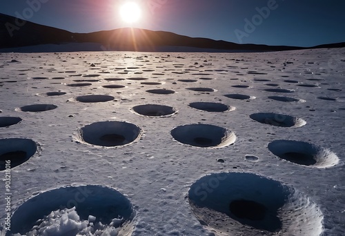 The watermark will not be included on Canvas Print.: The surface of an icy moon with deep craters filled with reflective ice, casting long shadows and gl