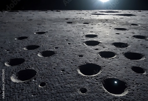 The watermark will not be included on Canvas Print.: The surface of an icy moon with deep craters filled with reflective ice, casting long shadows and gl