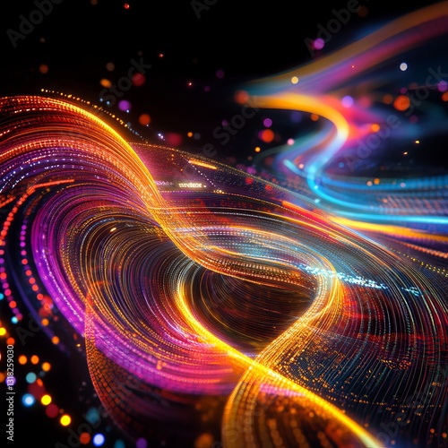 The watermark will not be included on Canvas Print.: This mesmerizing abstract image showcases vibrant swirling light trails in a dynamic digital space,