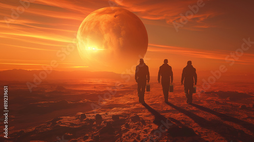 The watermark will not be included on Canvas Print.: Three astronauts are walking across a desert planet