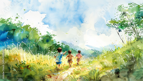 The watermark will not be included on Canvas Print.: Three children are running through a grassy field