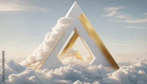 Canvas Prints three-dimensional golden triangle surrounded by white cumulus clouds in a dreamy and surreal fantasy