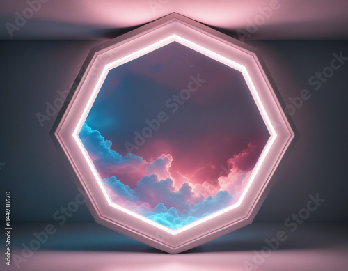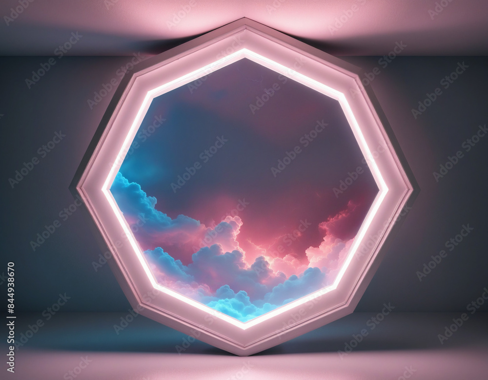 Canvas Prints three-dimensional hexagonal frame with neon pink and blue cloud inside, creating a surreal atmospher