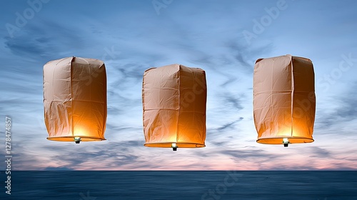 Canvas Prints three glowing lanterns float against a serene twilight sky over calm waters, creating a tranquil and - Canvas Prints Canvas Prints three glowing lanterns float against a serene twilight sky over calm waters, creating a tranquil and - Canvas Prints