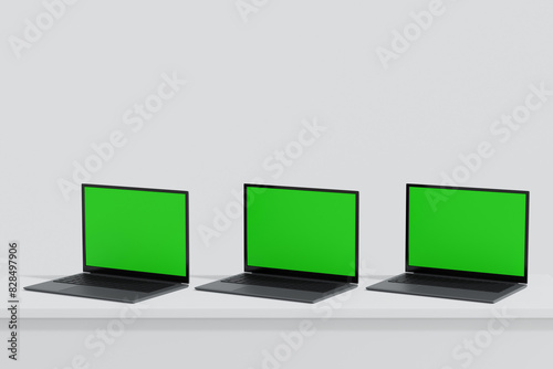 Canvas Prints three laptop open to show green screen display on white background, application website present, 3d  - Canvas Prints Canvas Prints three laptop open to show green screen display on white background, application website present, 3d - Canvas Prints