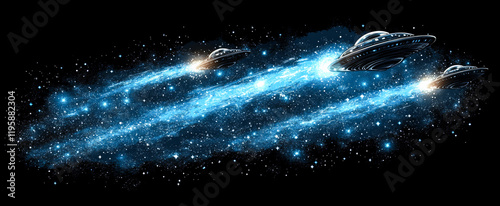 The watermark will not be included on Canvas Print.: Three spaceships are flying through space with a blue trail behind them - the trail is made up of gli