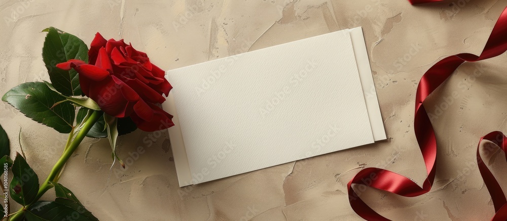 The watermark will not be included on Canvas Print.: Top view of a greeting card mockup on a beige background adorned with a red rose and ribbon offering