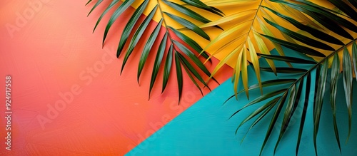 The watermark will not be included on Canvas Print.: Top view of vibrant tropical date palm leaves against a colorful backdrop with copy space image