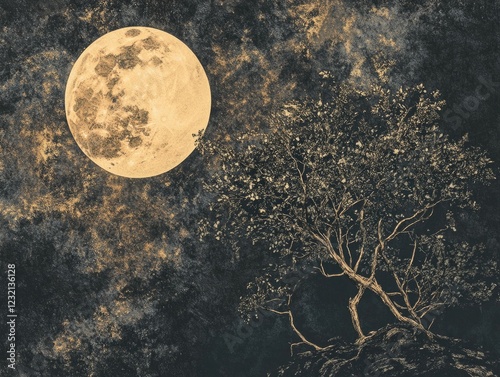 The watermark will not be included on Canvas Print.: Tree at night with full moon