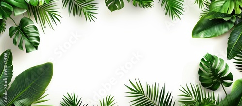 The watermark will not be included on Canvas Print.: Tropical green leaves on white background with leaf pattern and central copy space image