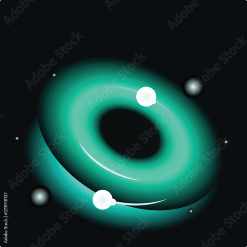 The watermark will not be included on Canvas Print.: Turquoise torus rotating in dark space with planets and stars, generating a cosmic atmosphere