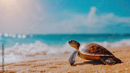 Canvas Prints turtle on sandy beach with ocean waves and bright sunny sky.