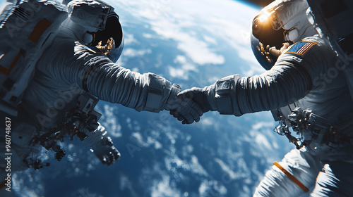 The watermark will not be included on Canvas Print.: Two astronauts touching hands in space with earth in the distance