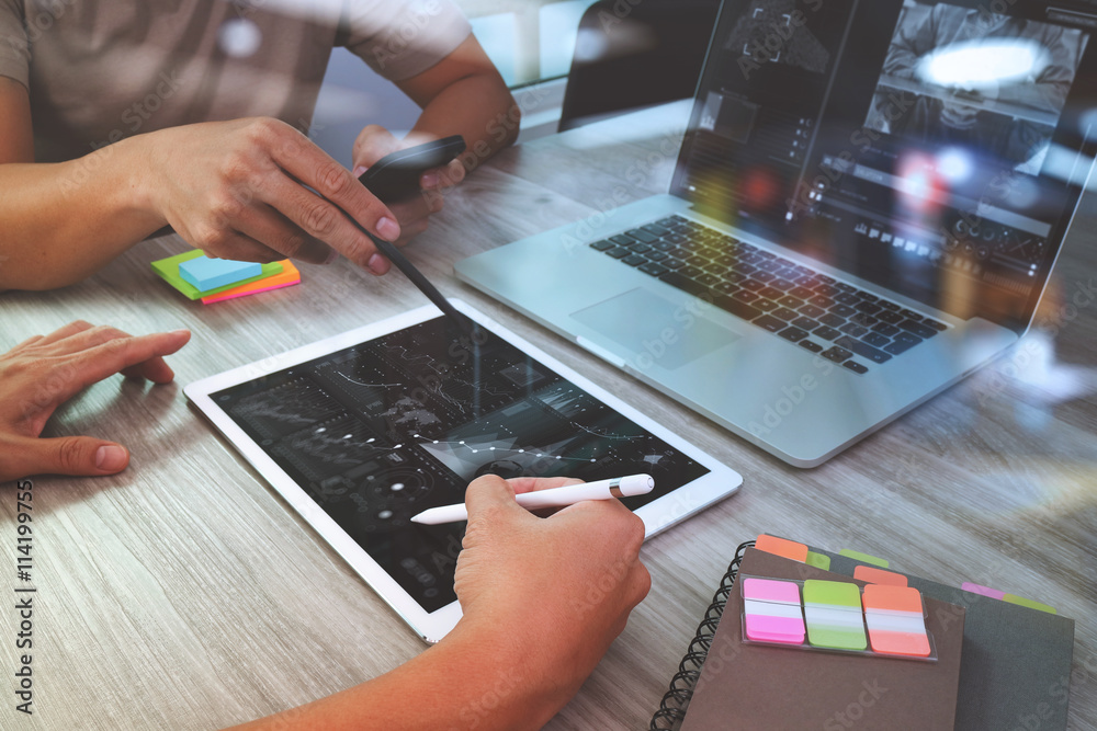 The watermark will not be included on Canvas Print.: Two colleagues interior designer discussing data and digital tab