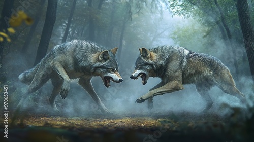 Canvas Prints two fierce wolves confront each other in a dramatic display of power and intensity amidst a misty fo