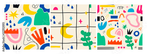 The watermark will not be included on Canvas Print.: Various hand drawn shapes and doodle objects - set of three colorful abstract contemporary modern tre