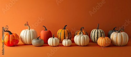 The watermark will not be included on Canvas Print.: Various pumpkins displayed against an orange backdrop in a copy space image