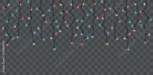 The watermark will not be included on Canvas Print.: Vector decorative horizontal border with hanging christmas light chains on dark background