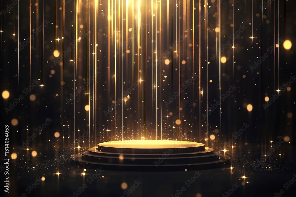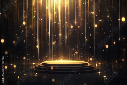 The watermark will not be included on Canvas Print.: Vector illustration of a podium pedestal with golden light rays and bokeh lights on a dark backgroun