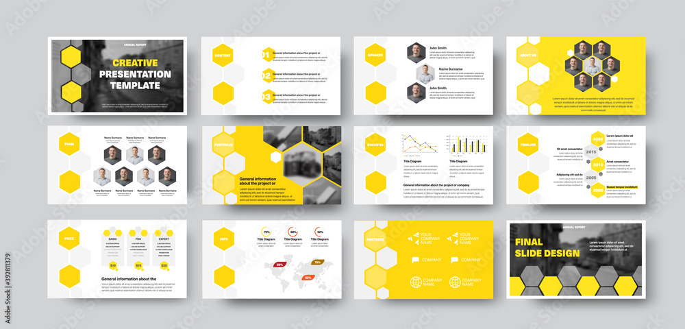The watermark will not be included on Canvas Print.: Vector infographic template with hexagons, photos, presentation slide with yellow design -