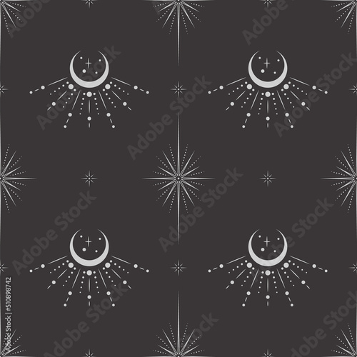 The watermark will not be included on Canvas Print.: Vector seamless dark celestial pattern with ornate shiny stars and crescents with beams on a black -