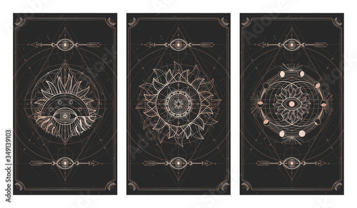The watermark will not be included on Canvas Print.: Vector set of three dark illustrations with sacred geometry symbols, grunge textures and frames - ima