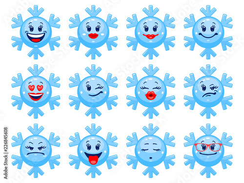 The watermark will not be included on Canvas Print.: Vector set of winter emoticons - collection of snowflakes with different emotions in cartoon style on
