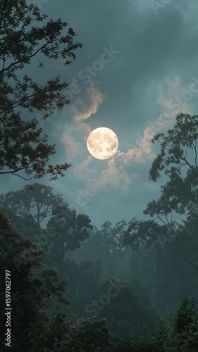 The watermark will not be included on Canvas Print.: Vertical video full moon through clouds in a lush forest