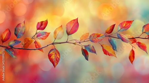 The watermark will not be included on Canvas Print.: Vibrant autumn branch with colorful leaves against a bokeh background -
