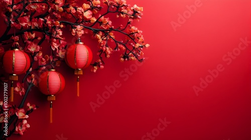 The watermark will not be included on Canvas Print.: Vibrant chinese new year red backdrop with festive symbols and colorful lanterns creating a lively a