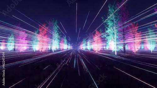 The watermark will not be included on Canvas Print.: Vibrant glowing trees along a dark road with dynamic light streaks creating a futuristic and abstrac