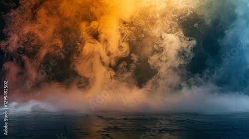 The watermark will not be included on Canvas Print.: Vibrant swirl of multicolored smoke hovering over a dark floor with misty fog, isolated on a black b