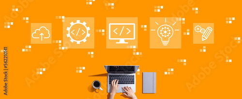 The watermark will not be included on Canvas Print.: Web development concept with person working with laptop