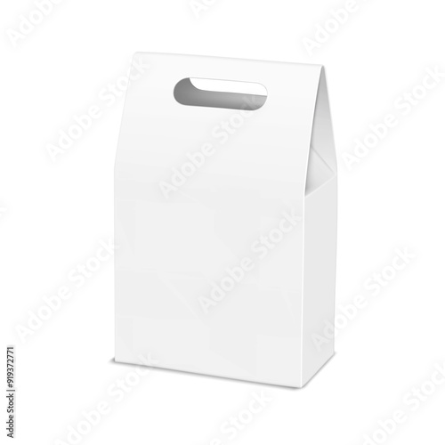 The watermark will not be included on Canvas Print.: White blank folding cardboard gable box with die cut carry handle - realistic 3d vector mock-up - pape