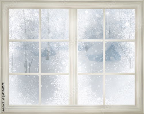 The watermark will not be included on Canvas Print.: Window with winter view of snowy background -