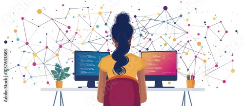 The watermark will not be included on Canvas Print.: Woman working on her computer with a network of connections behind her -