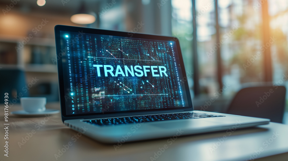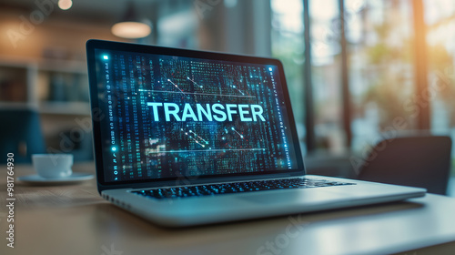 The watermark will not be included on Canvas Print.: Word "transfer" display on laptop screen with a digital transaction background on the table in moder