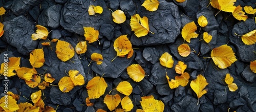 The watermark will not be included on Canvas Print.: Yellow leaves scattered on the ground with copyspace used as a background