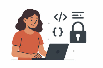 Female programmer coding securely on laptop, vector illustration for software development, web security, and open source projects. Woman developer working with code and padlock icons.