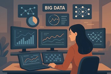 A data analyst working on big data visualizations and analytics in a modern office setting. High-resolution digital artwork.