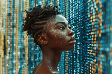 digital woman silhouette facing data lights in high-tech urban setting : generative ai