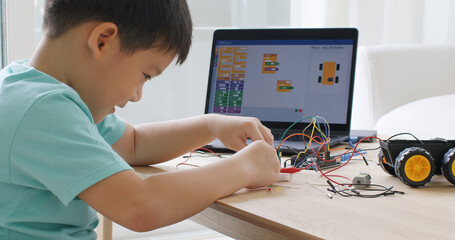 asia home school young small kid happy smile self study online lesson excited make ai circuit toy. s