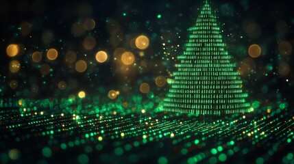 a neon green binary code christmas tree glows among soft blurred lights this season