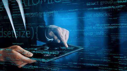 a business professional focuses on coding with a tablet against a backdrop of abstract digital data,